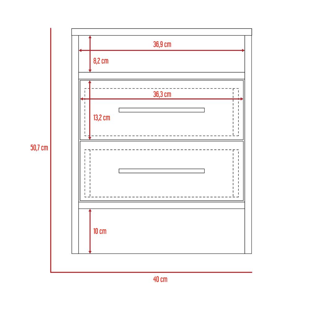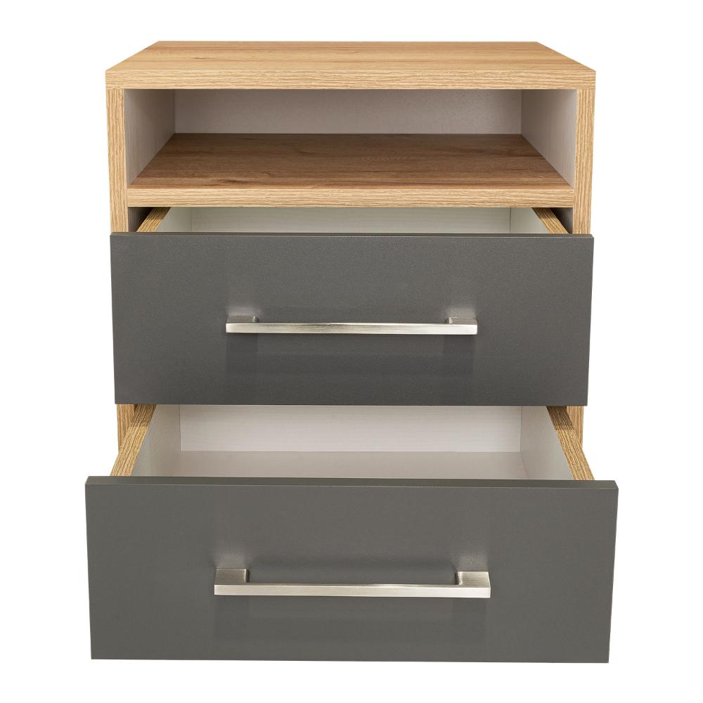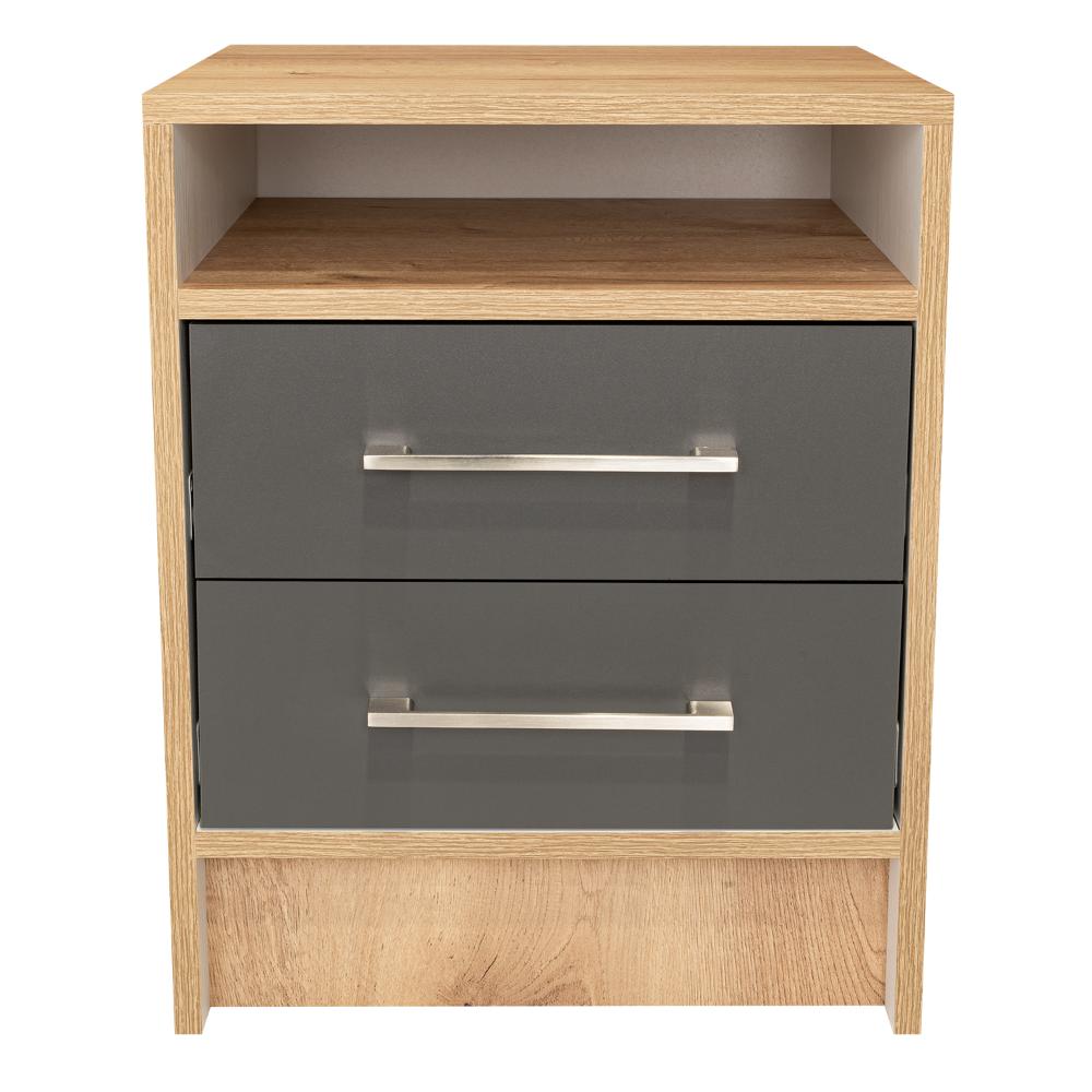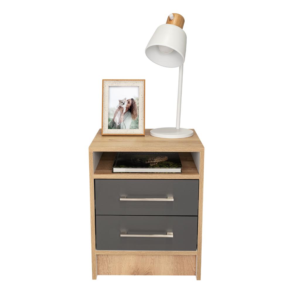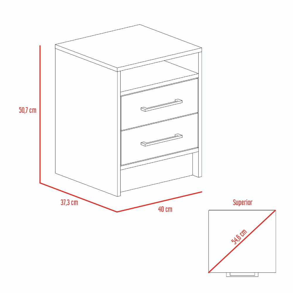 Mesa de Noche, con manijas metalicas, dos cajones, espacio para libros y objetos decorativos.