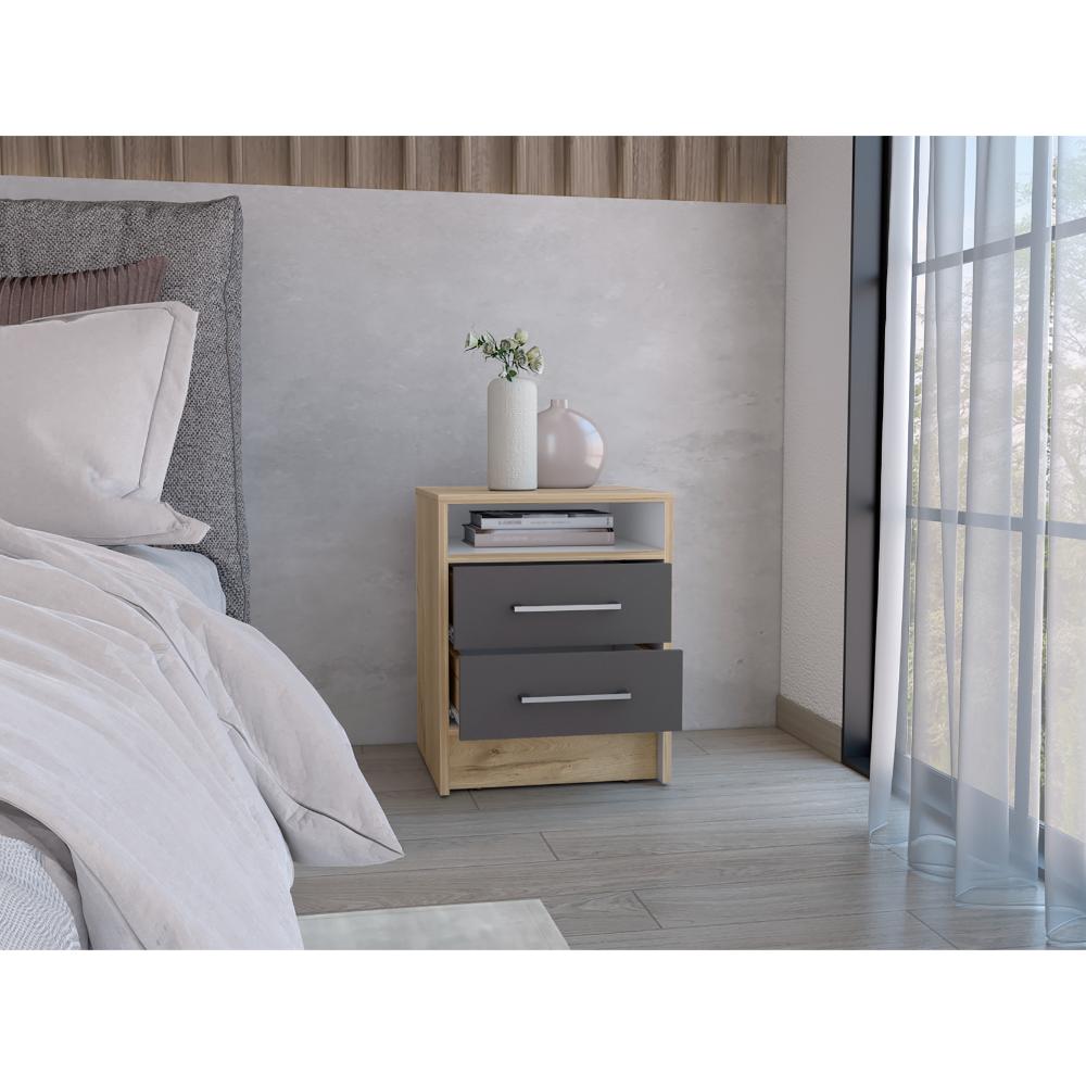 Mesa de Noche Douglas, Beige y Plata Oscuro, con Un Entrepaño Superior y Dos Cajones Organizadores