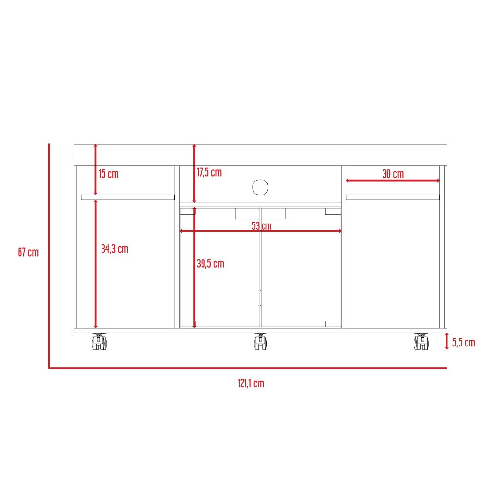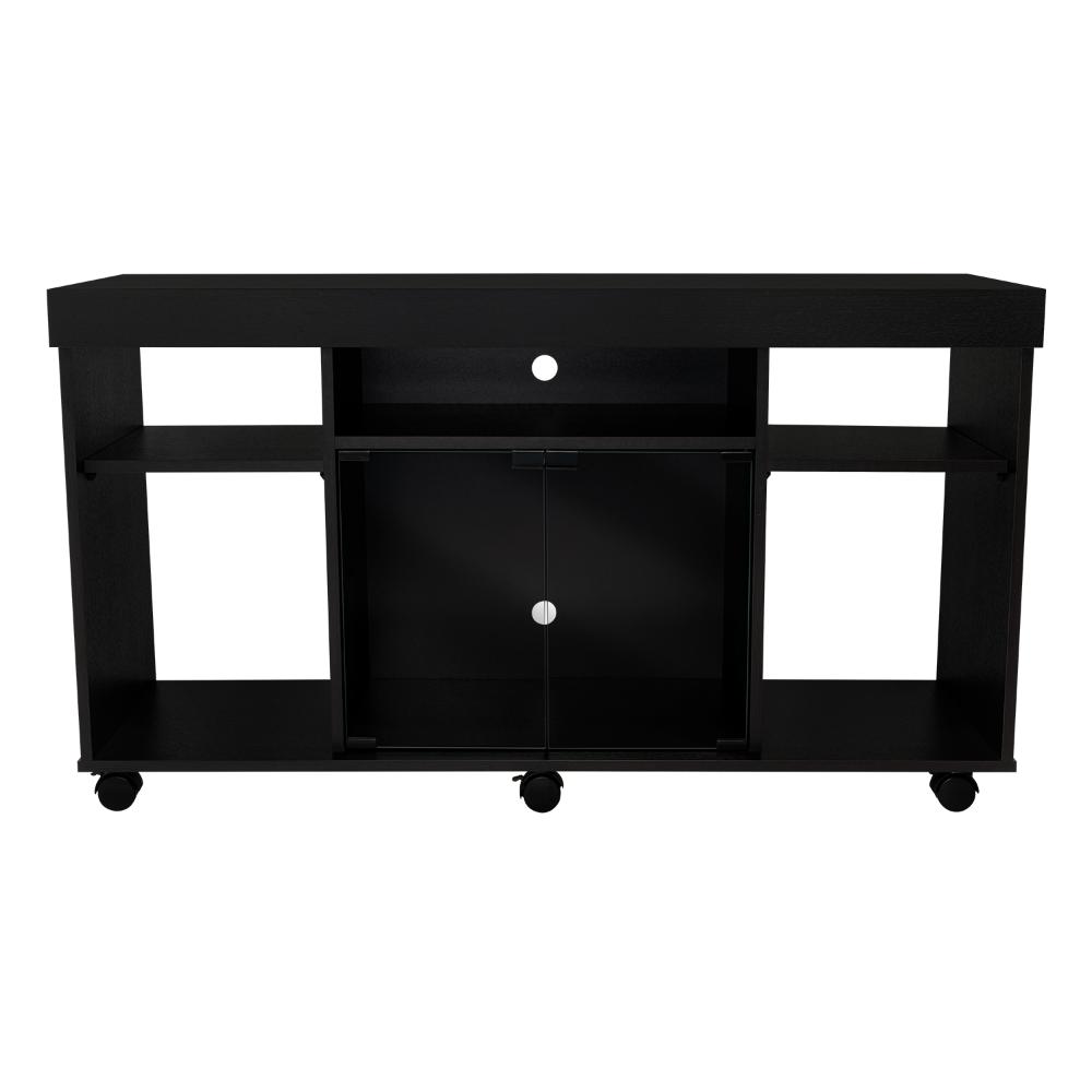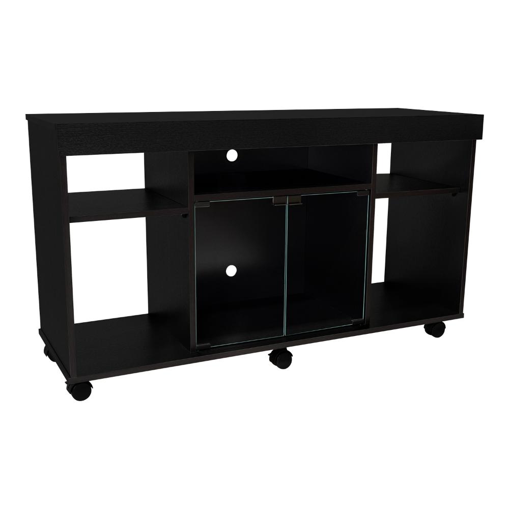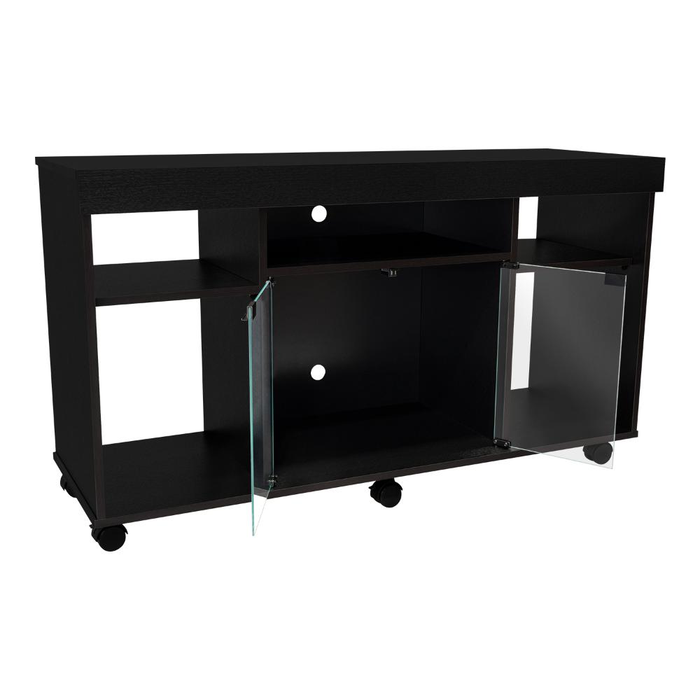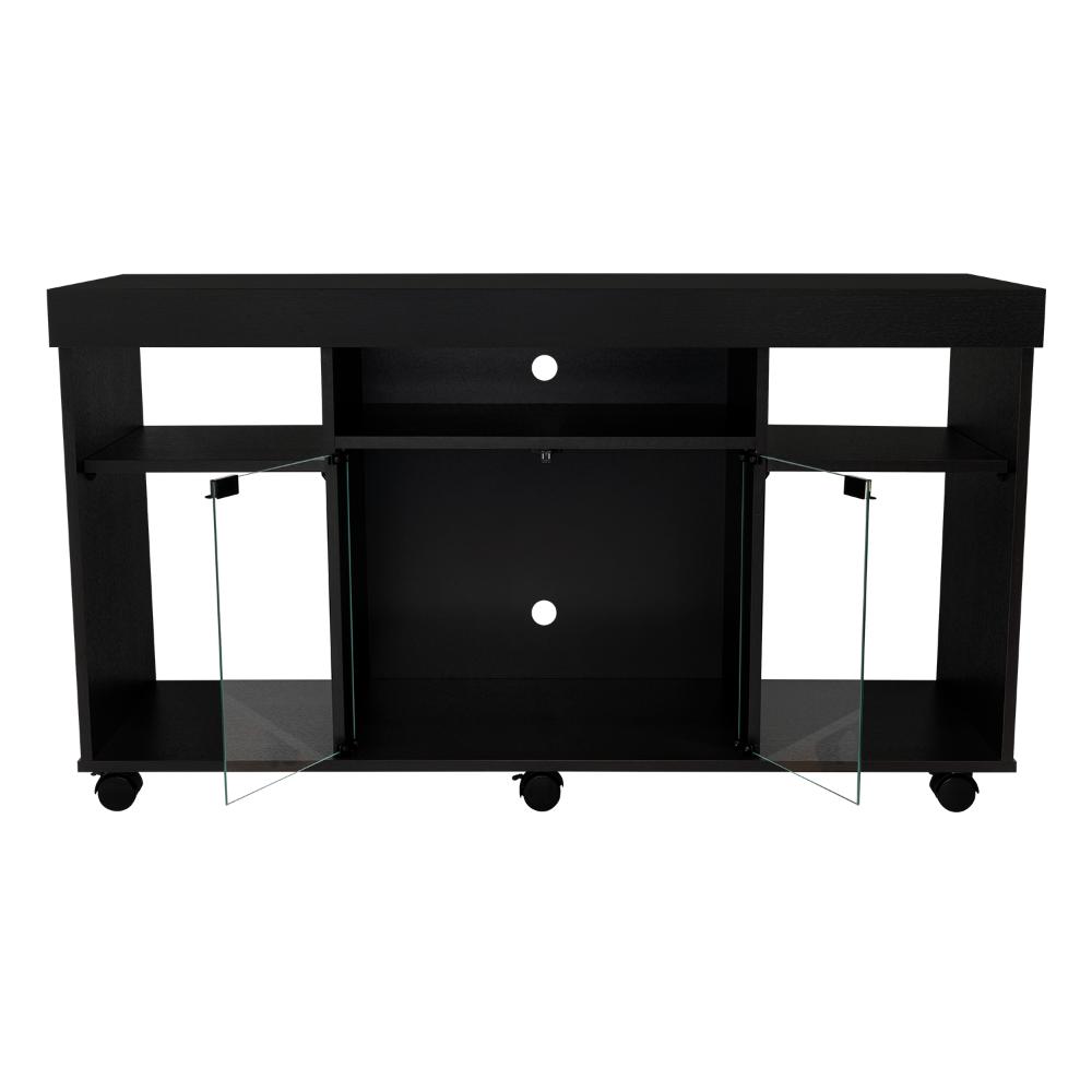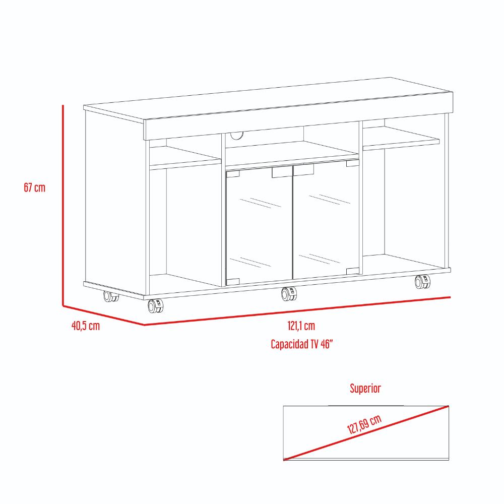 Mesa para TV, espacio para televisores hasta de 46”, espacio para equipos de audio y video, dos puertas abatibles en vidrio, rodachinas con y sin freno para su fácil desplazamiento.