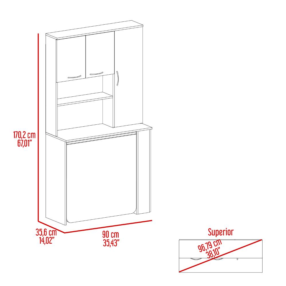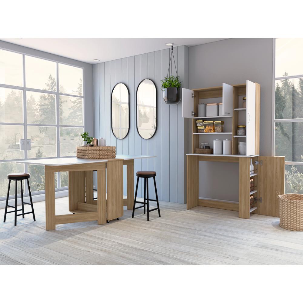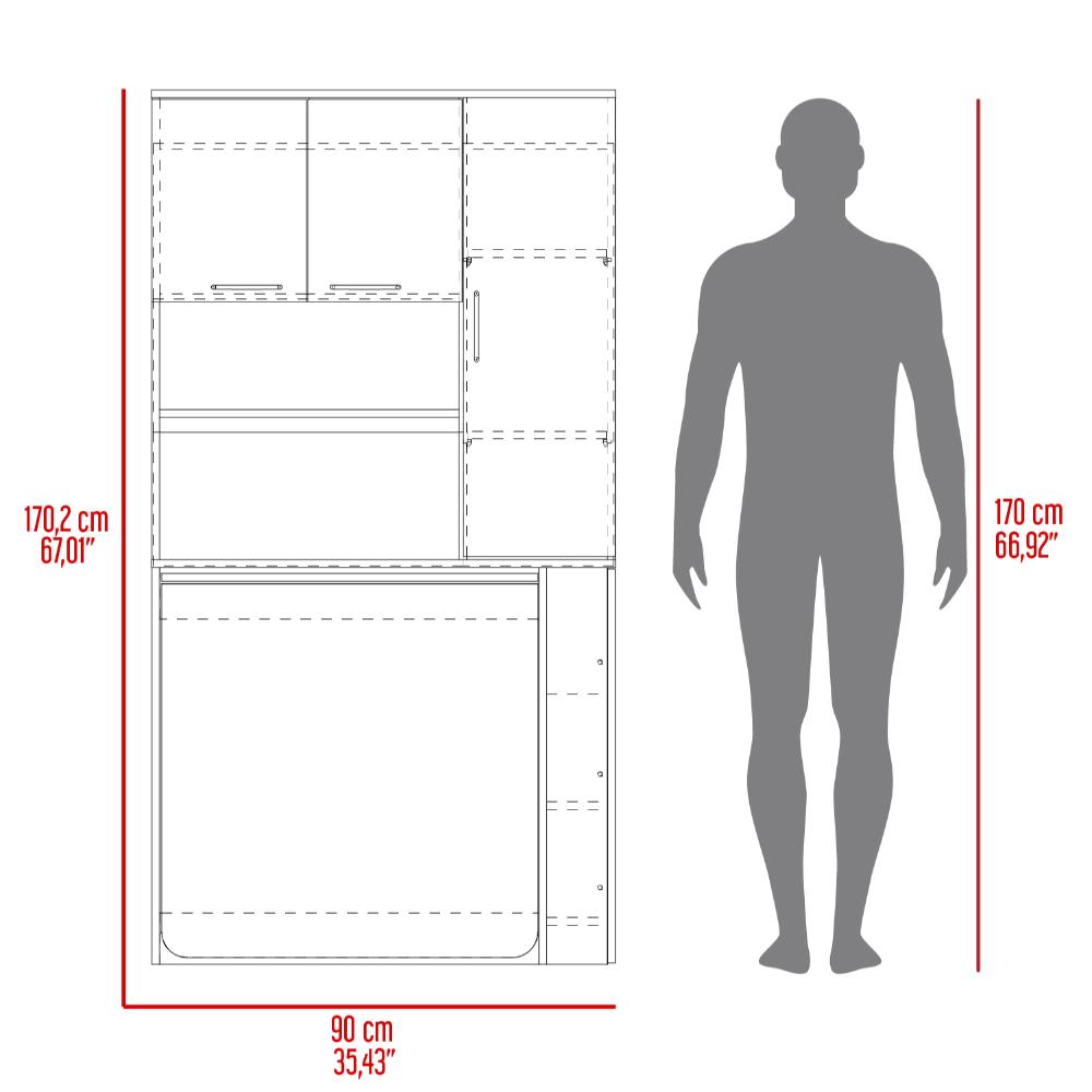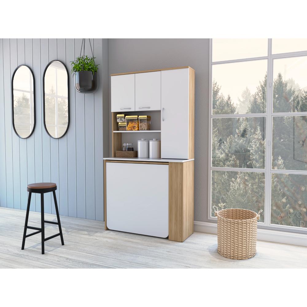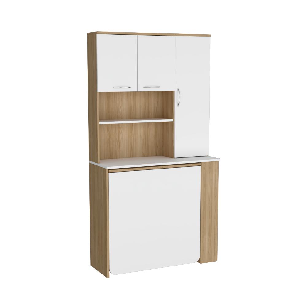 Alacena, con tres puertas batientes, mesa móvil plegable, amplios espacios para guardar alimentos y electrodomésticos.