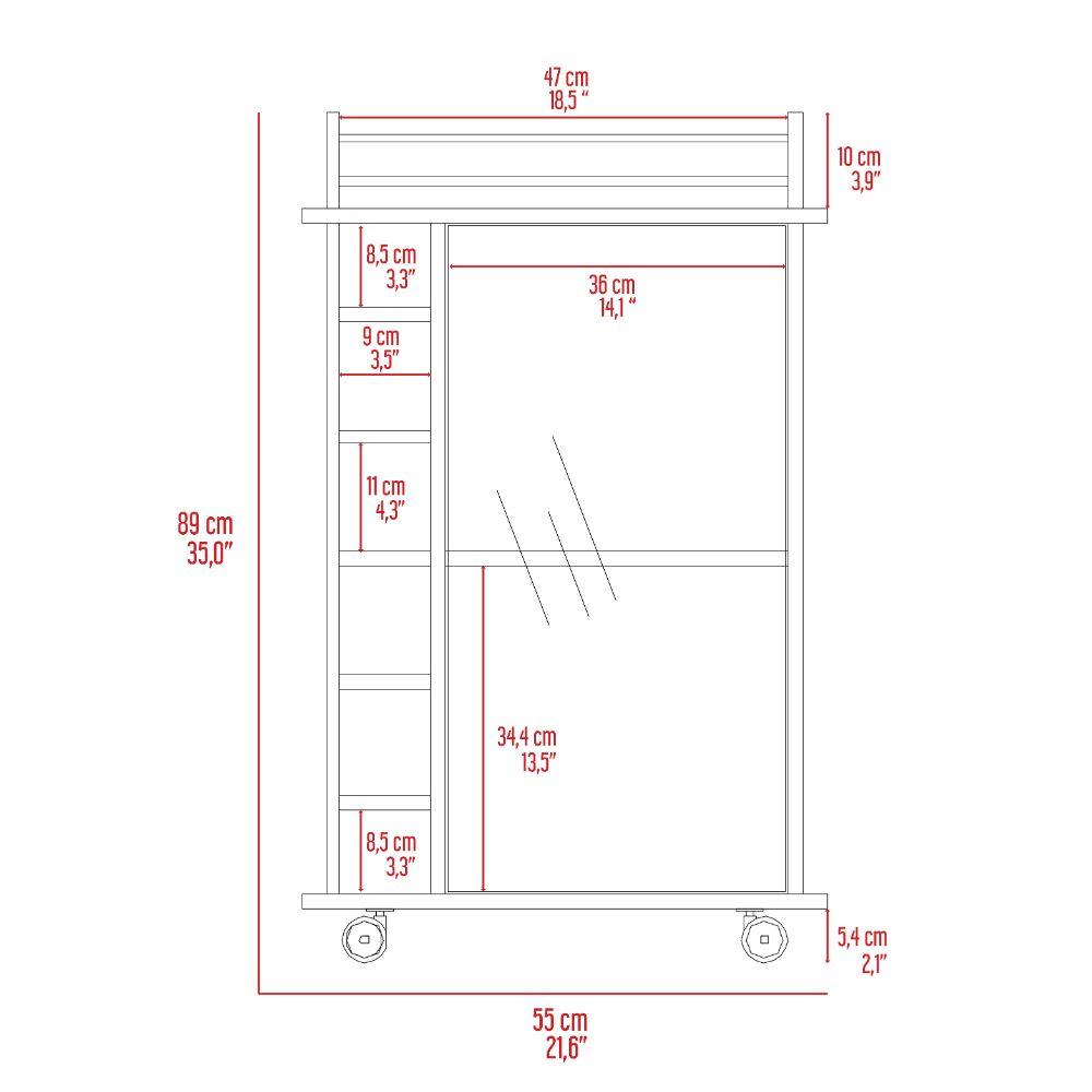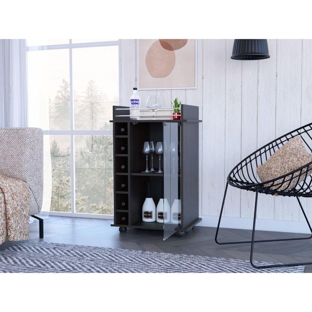 Bar, con 1 puerta batiente de vidrio, rodachines, espacio para porta botellas y copas.