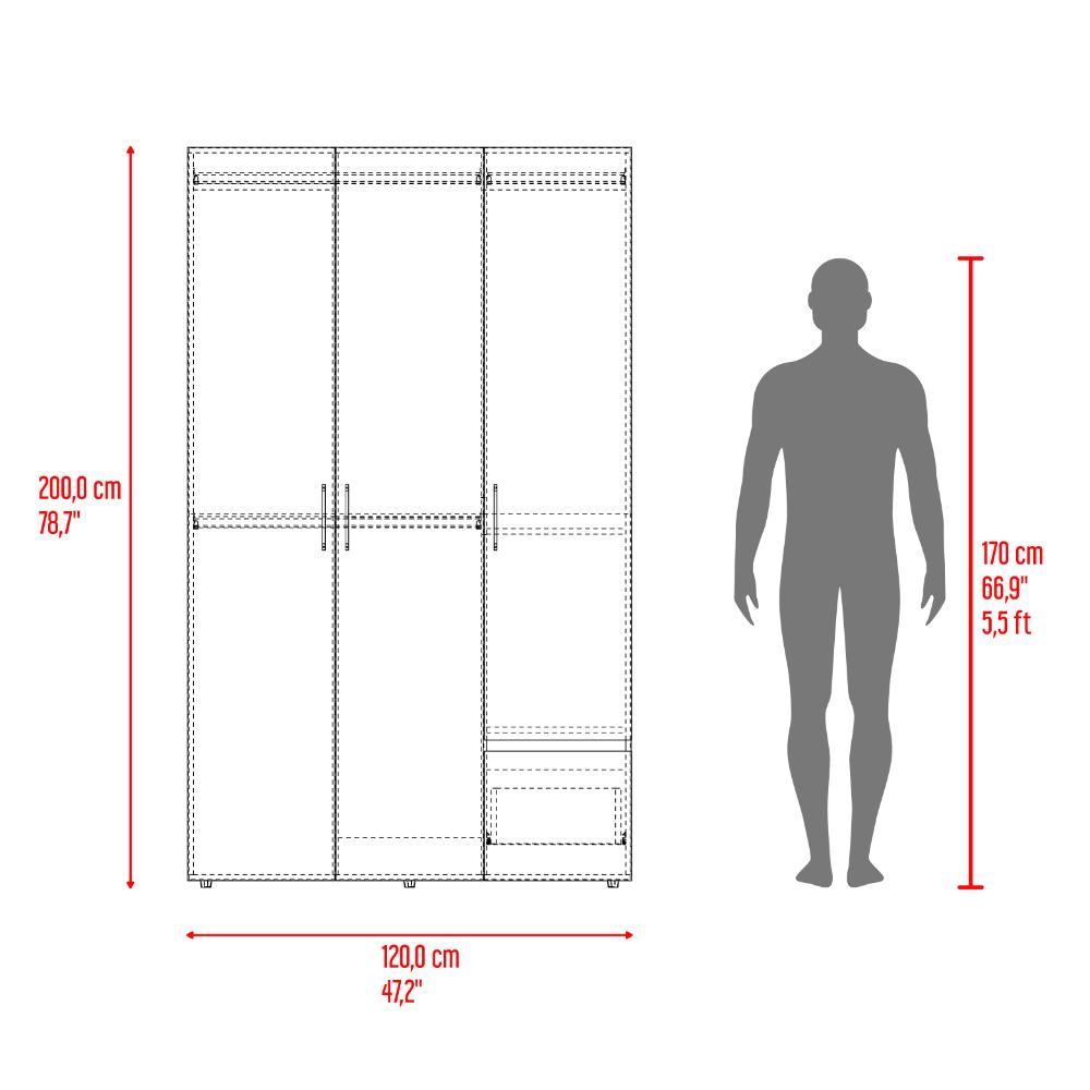 Closet, con 3 puertas abatibles, 1 cajón multiusos, tubos para colgar ropa, 2 entrepaños divisores, facil de ensamblar e instalar.