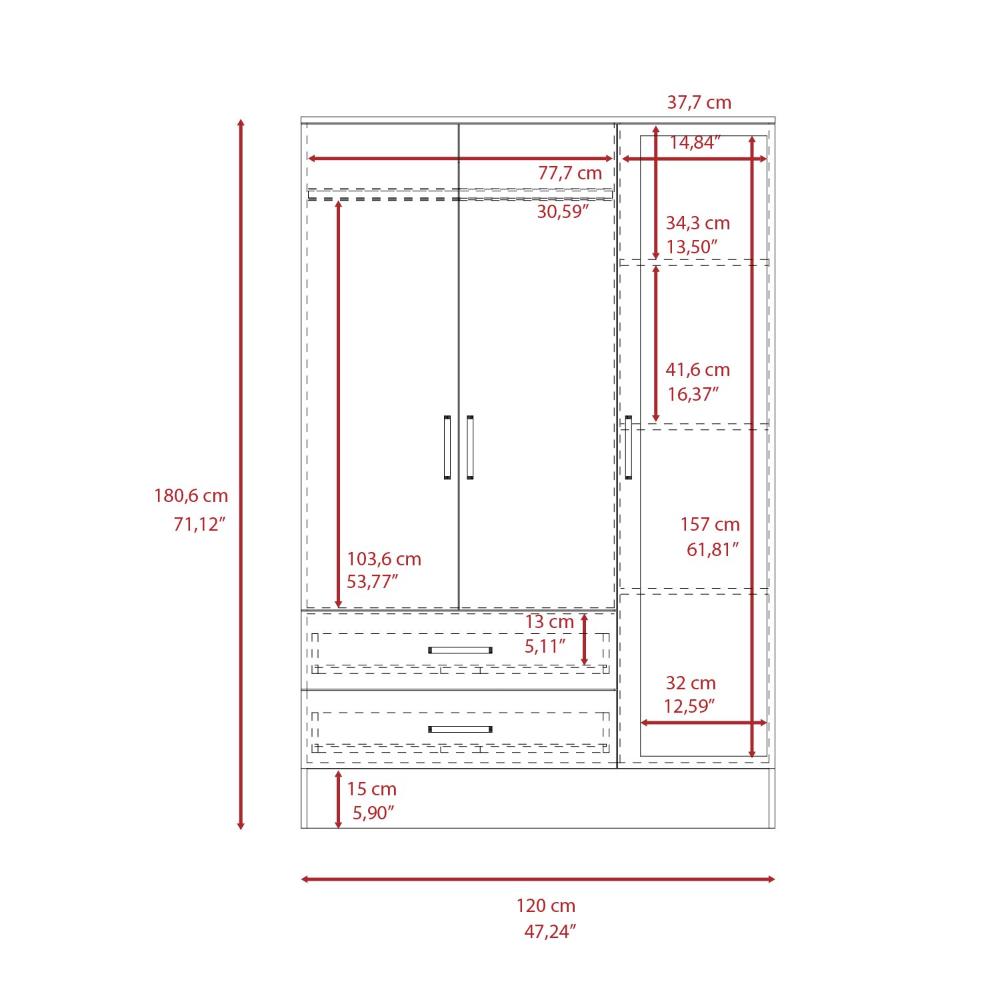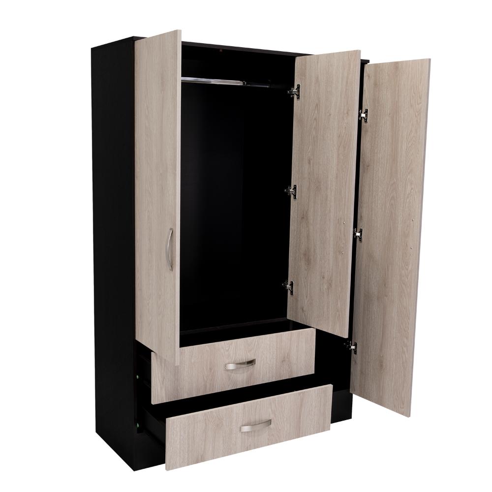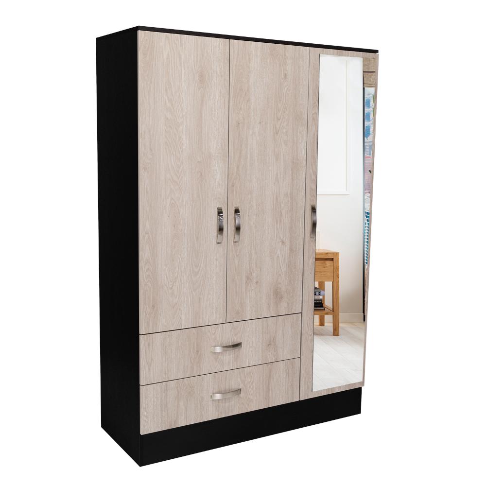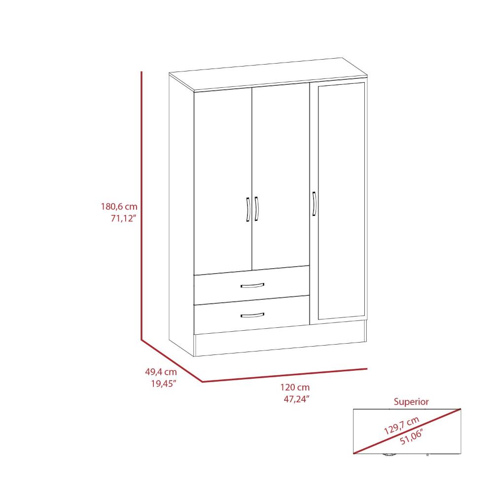 Closet, con espejo, tubo para colgar ropa, 3 puertas abatibles, entrepaños y dos cajones. Incluye espejo.