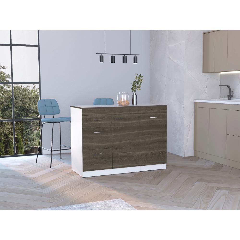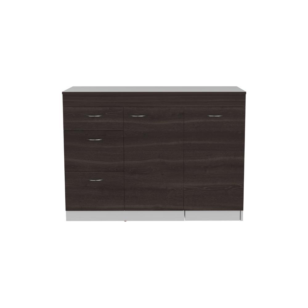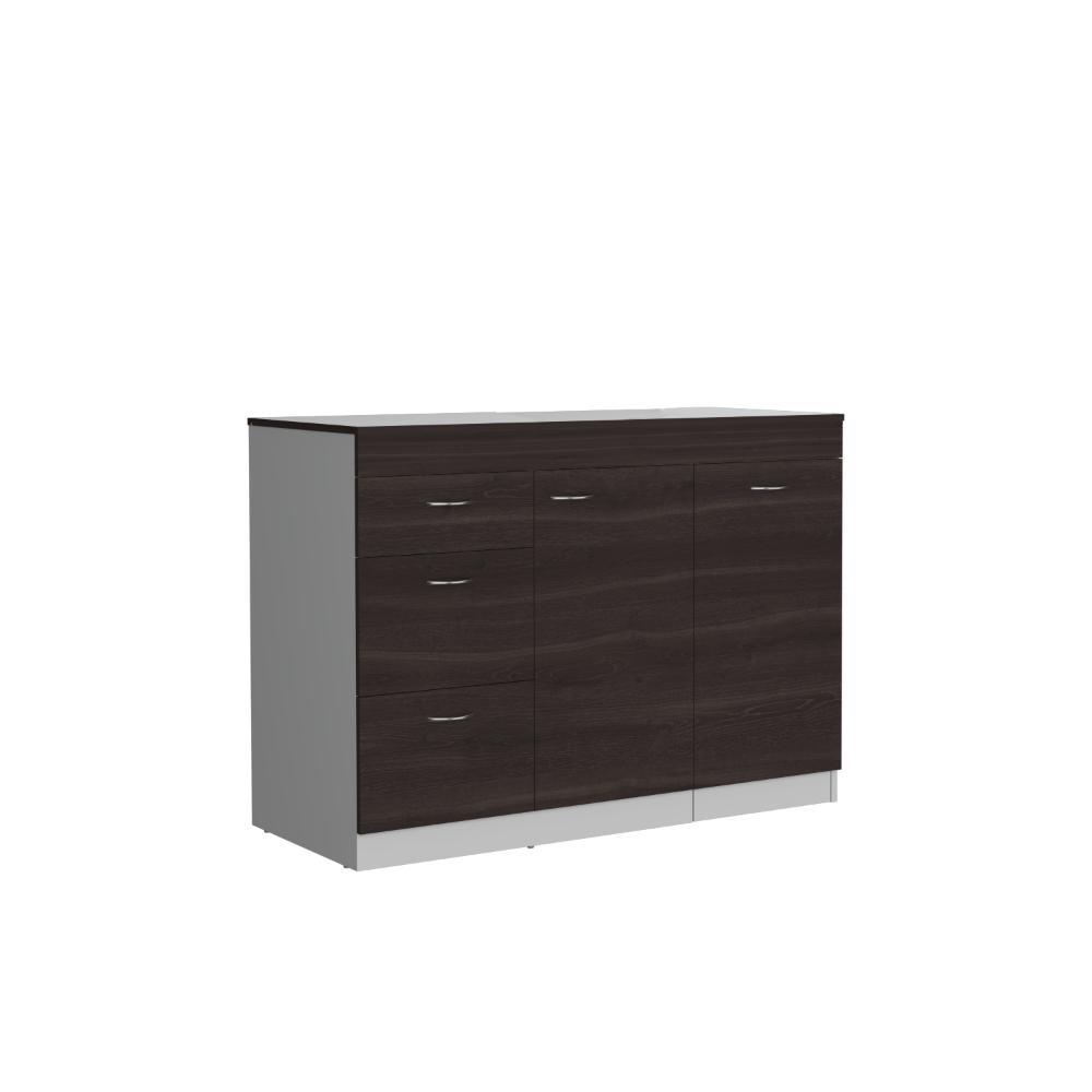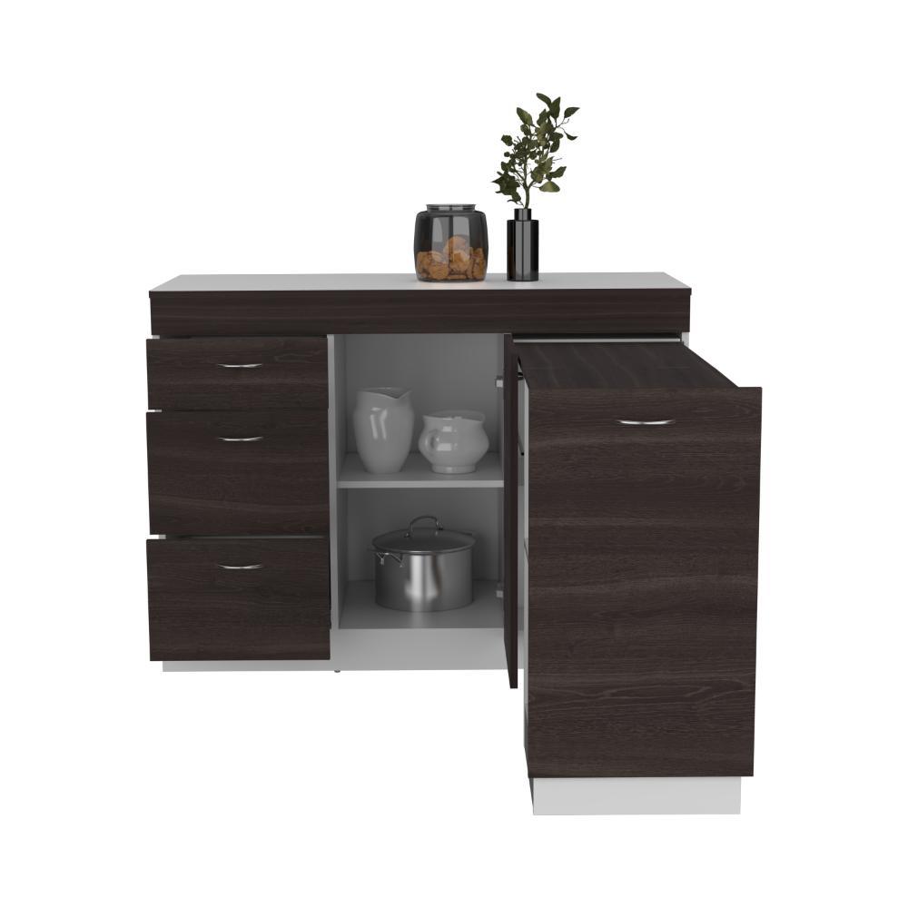 Mueble inferior, con tres cajones multiusos, correderas metalices, superficie auxiliar plegable con rodachinas, amplia superficie superior.