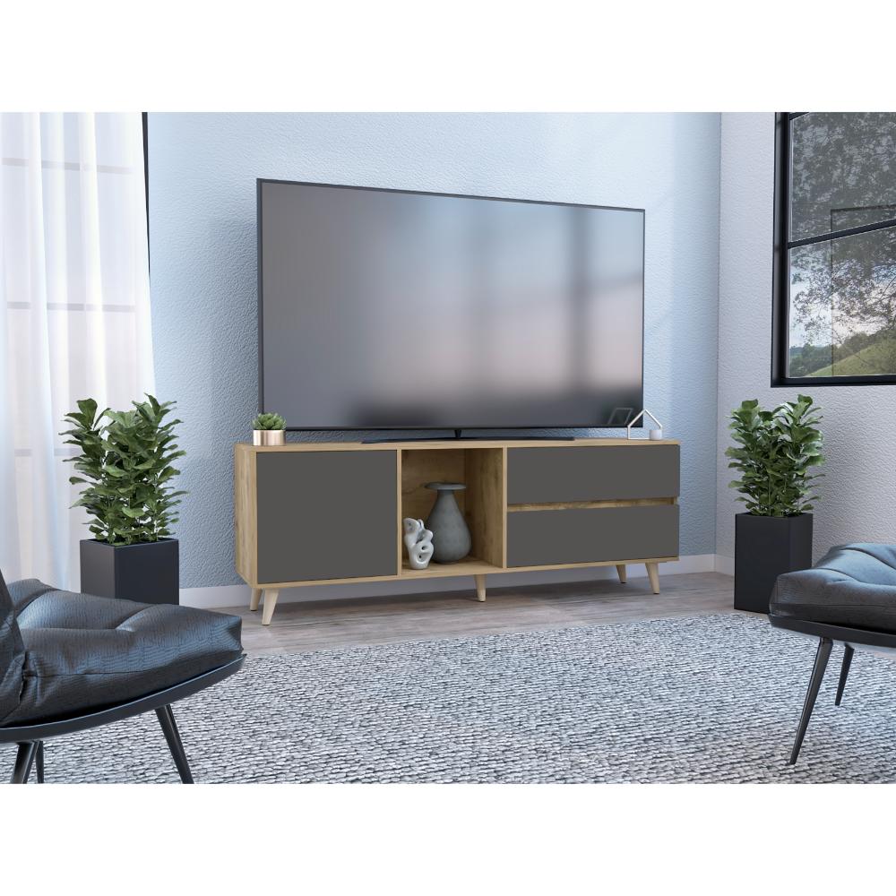 Mesa para TV, con 1 puerta abatible, 2 cajones, capacidad para televisor de hasta 65 pulgadas, espacio para consolas y dispositivos de audio y video.