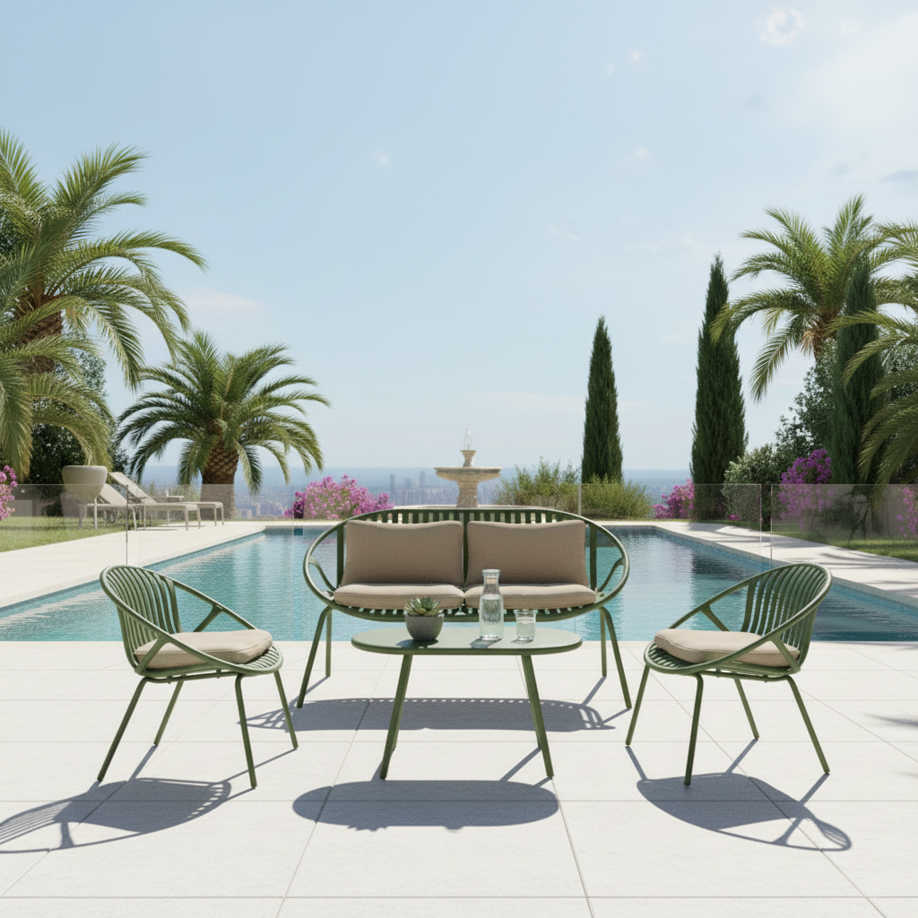 Elaborado en Polipropileno y protección a los rayos UV el set incluye mesa centro, dos sillas y un banco en patas metalicas, en Color Verde Olivo
